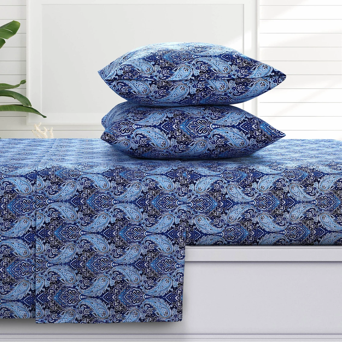 Made of woven 170 gsm 100% cotton, these cozy paisley print flannel sheets from Azores are napped and brushed for velvety soft hand feel. This sheet set is designed to fit most extra deep mattresses with its fully-elasticized extra deep fitted sheet. The pillowcase(s) feature an envelope closure. Set includes a generously sized flat sheet, a fitted sheet that fits mattresses up to 20 in. deep and two pillowcases (on full, queen, king) or one pillowcase on (twin/twin XL). Machine washable. Oeko-tex certified. Color: Deep Blue. Model: SOFIFLOSHE.