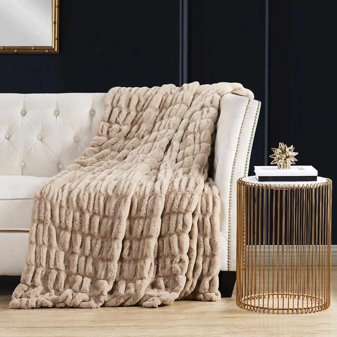 Add a luxurious and modern style to any space with the Ruched Faux Rabbit Fur by Badgley Mischka. This is the epitome of softness with a faux fur face reversing to an ultra soft solid faux mink. The simple hand ruched pattern is the perfect sophisticated detail. The 100% polyester fabric allows for the softest, faux fur fabric that’s perfect for decoration and even better for cuddling up with. Style: TH4371.