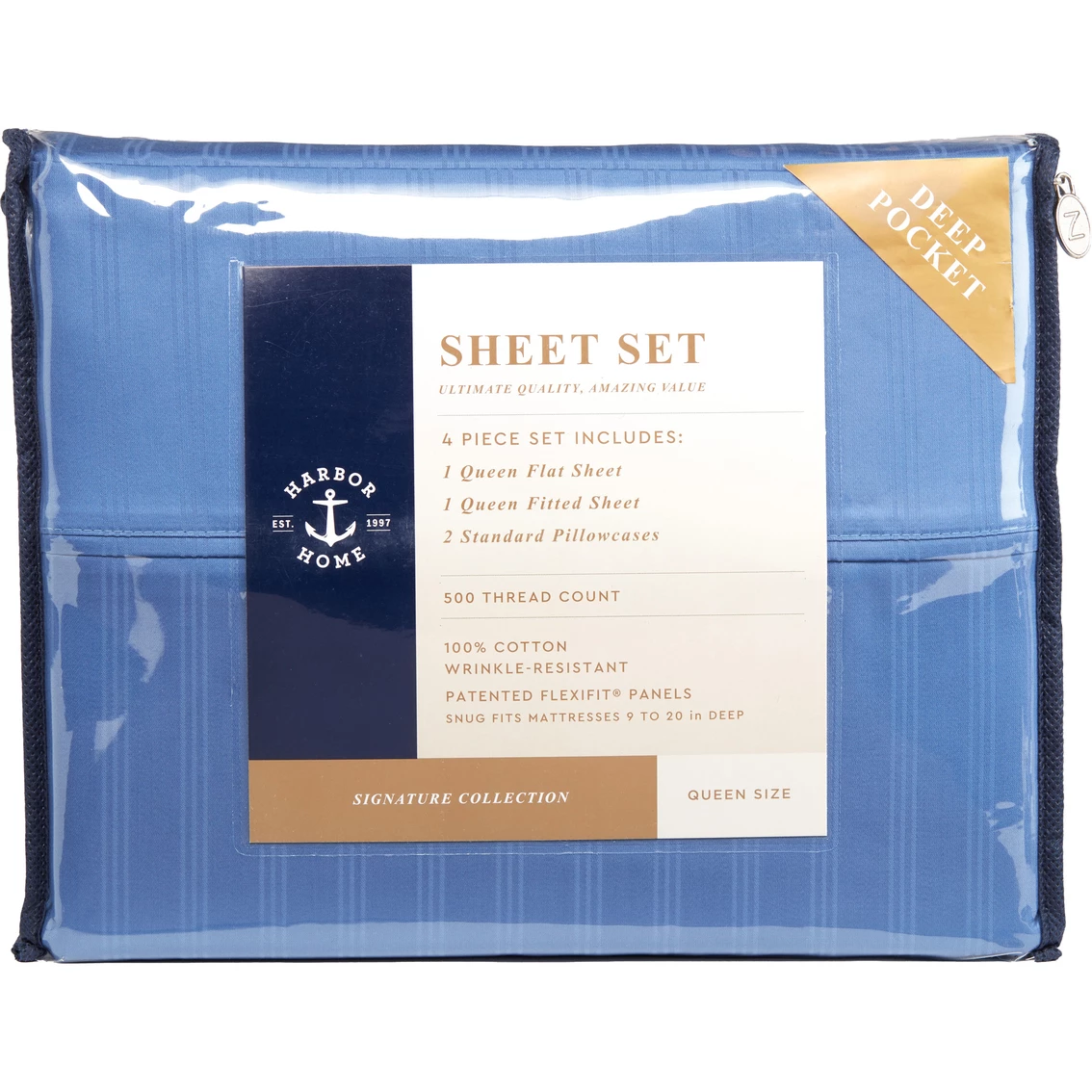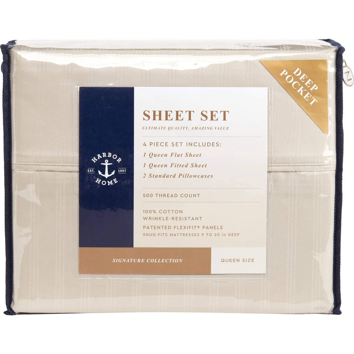 Soft, comfortable sheet set. Lay down to rest each night on a luxurious Harbor Home 500 thread count cotton, wrinkle-resistant sheet set with patented Flexifit. Deep pocket set fits mattresses up to 20 inches deep for luxurious and easy care bedding. Set includes flat sheet, fitted sheet and two pillowcases. Machine wash. Style: NXPS-SS-01.