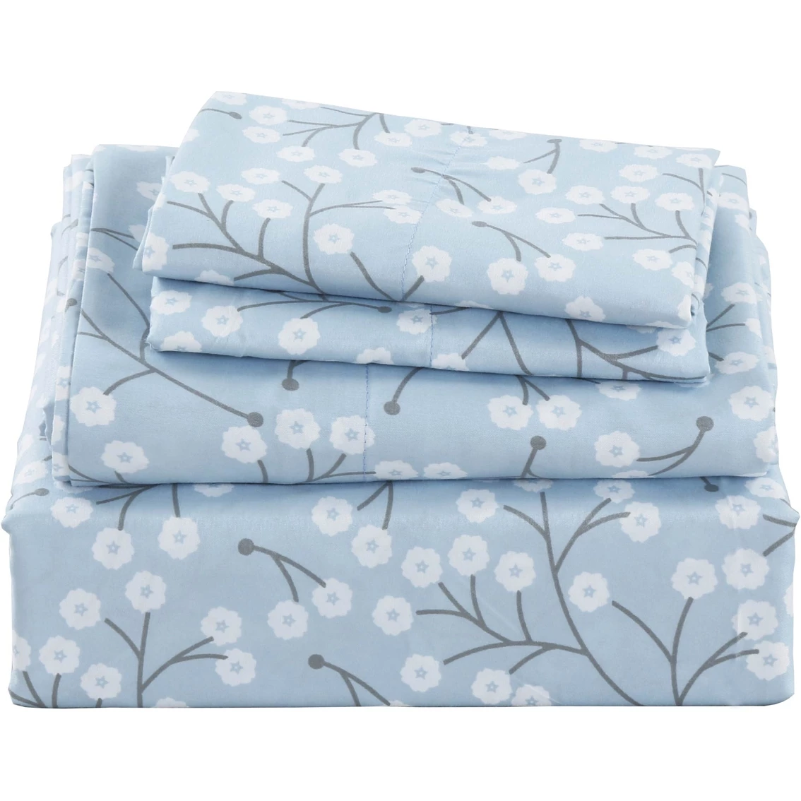 Upgrade your bedroom esthetic, with this 4-piece Kenyon Flower Blue Sheet Set from Harper Lane. This printed motif will add life to any room. The set is printed on poly microfiber and includes one fitted sheet, one flat sheet, and two pillowcases. One pillowcase in twin size. Lightweight, fade resistant. All items are machine washable for easy care. Style: 17218.