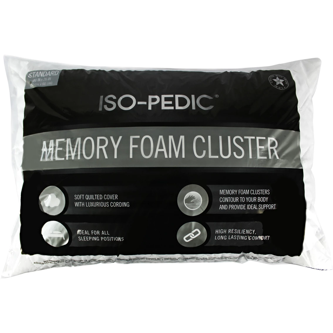 Stay sound asleep with the soft, comfortable Memory Foam Cluster Bed Pillow from Iso-Pedic. The standard size, microfiber quilted bed pillow is filled with shredded memory foam. Features a memory foam cluster that contours to your body, soft quilted cover and long-lasting comfort. Perfect for all sleeping positions. Model: 1500ISOMFQ.