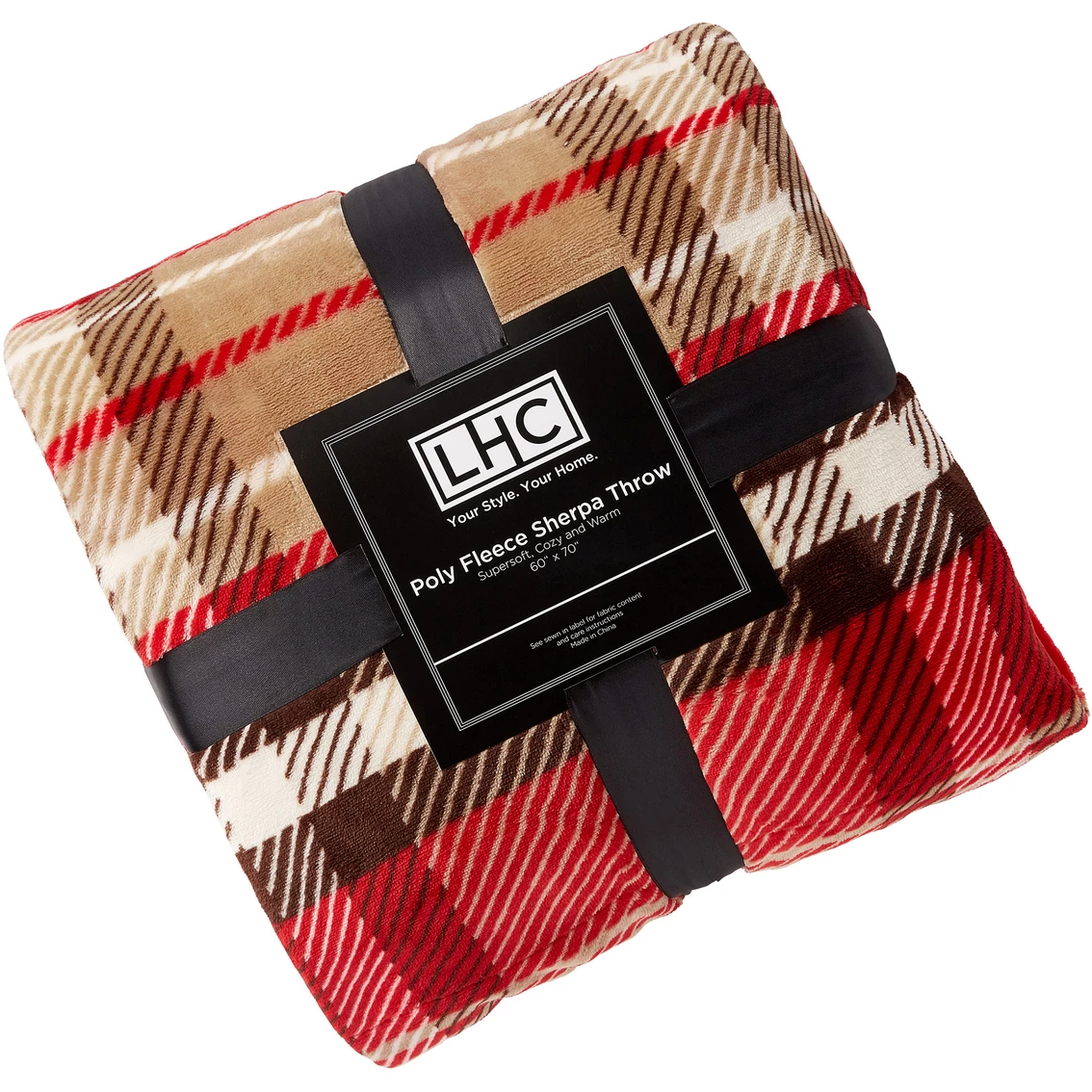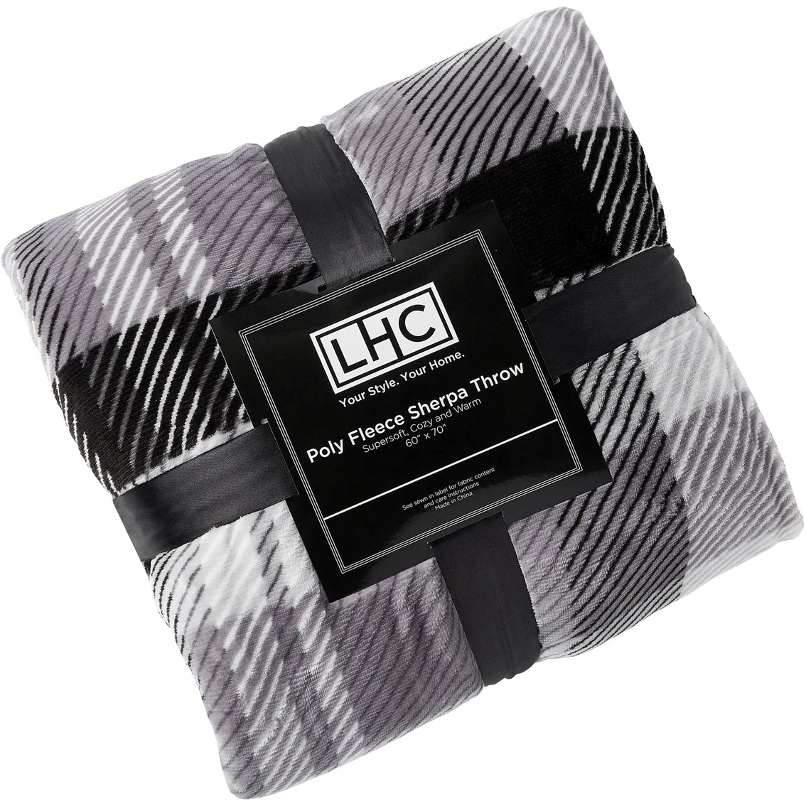 “Experience the luxurious plushness of the Poly Fleece Sherpa Throw Blanket by LHC. This plaid blanket is made of 100% high-quality polyester that’s woven to feel super soft and features a plush Sherpa lining on the back. This blanket can be used inside to stay cozy while watching a movie, or outside to keep warm at a concert or sporting event. The blanket measures 70 inches long and 60 inches wide, making it larger than most other blankets and great for use as a bedspread. The woven material is breathable for use in warmer weather and machine washable for softness and comfort that lasts. The black satin ribbon cross wrapping makes it great gift for housewarmings, weddings and holidays. LHC Your Style. Your Home.