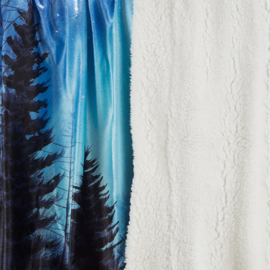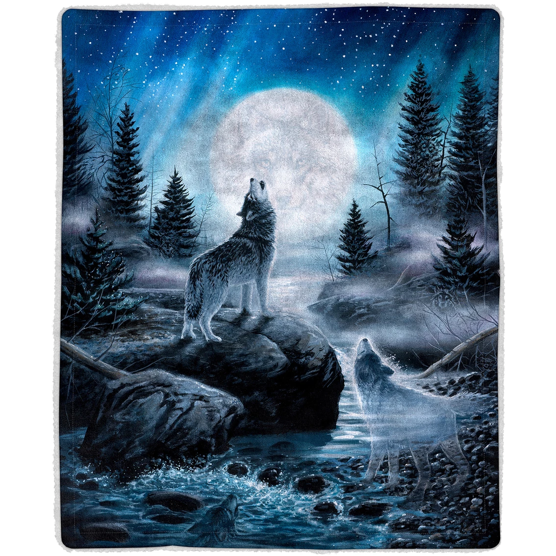 Bring the feel of the outdoors to your home with this appealing and comfortable Sherpa Fleece Blanket with Howling Wolf Pattern from Lavish Home. Warm and cozy, this luxurious lightweight Sherpa blanket is perfect for relaxing on the couch or sleeping in on a chilly weekend morning. With an outdoorsy wolf design in vibrant colors, you won’t have to compromise comfort for style. Fits generously over twin, full and queen-sized beds. 100% polyester fleece. Size: 50 x 60 in. Style: 64-WOLF.