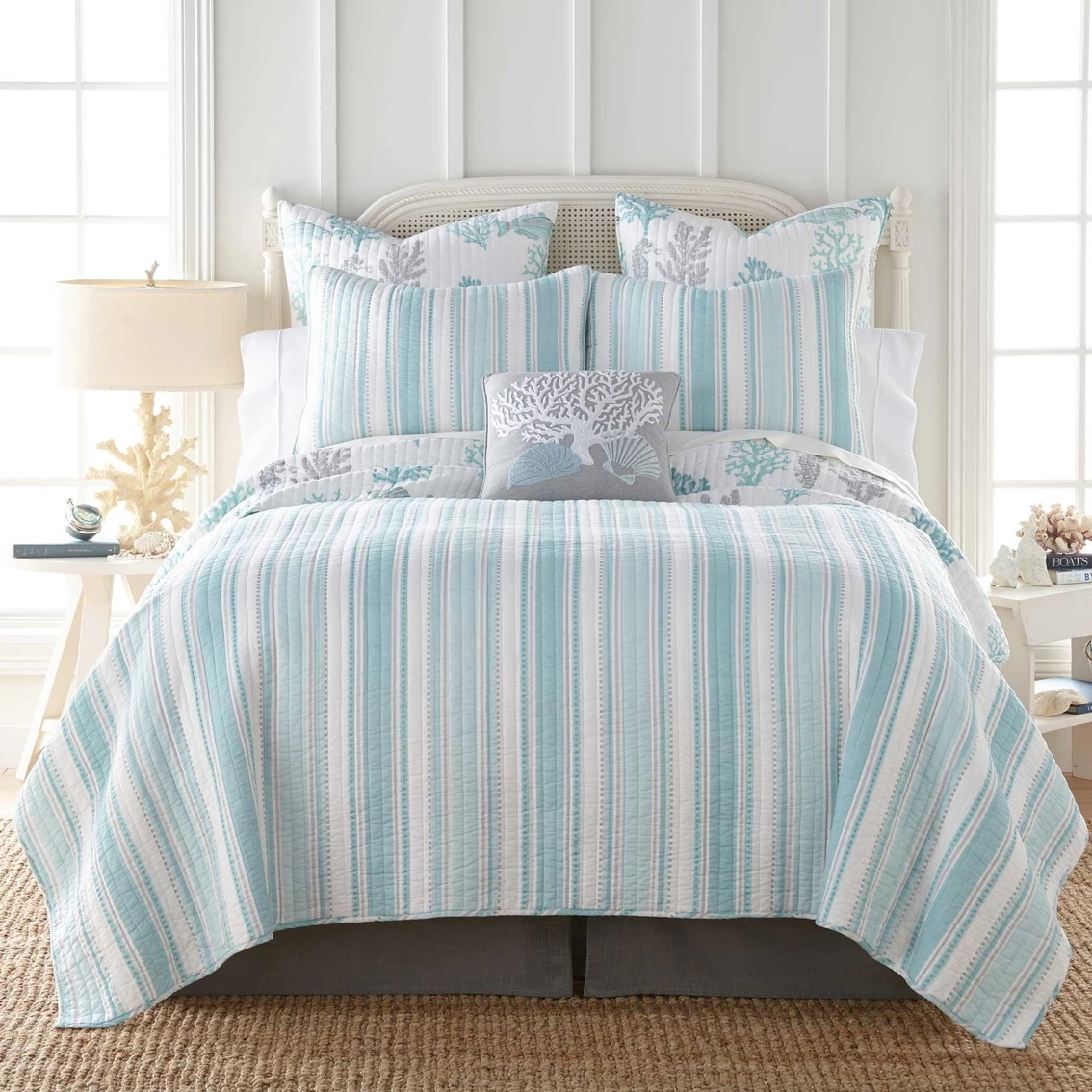 Your bedroom will boast of fresh, coastal vibes with the addition of the Levtex Home Cape Coral Euro Shams. Featuring elegant coastal motifs in soothing teals and greys, these euros are perfect for those looking for a sophisticated update and come in a set of two. Measuring 26 in. x 26 in., these euros are made from 100% prewashed cotton and are machine washable. Style: L16760SHE2.