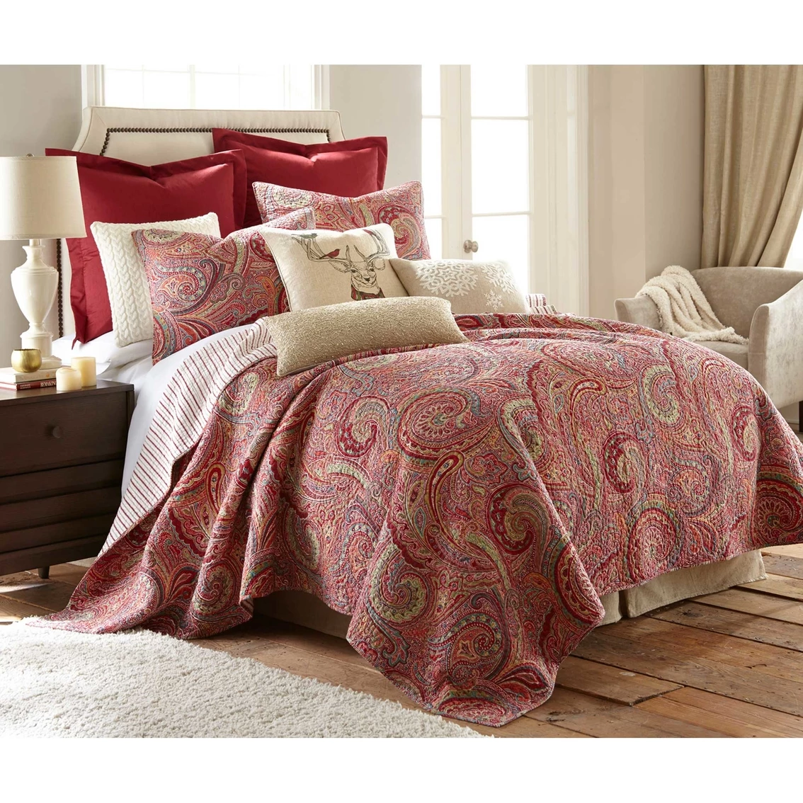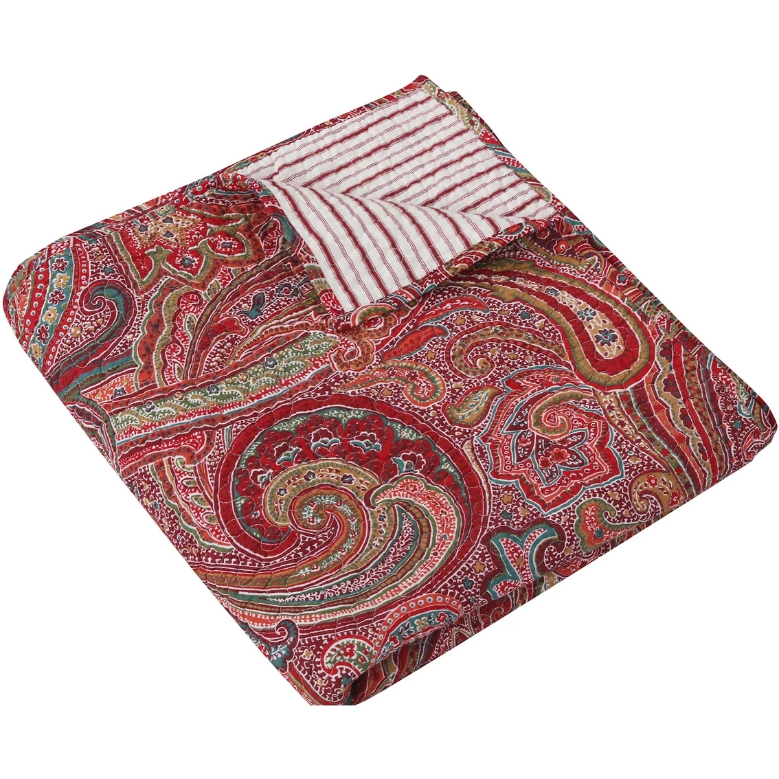Give your bedroom a lively update with the Levtex Home Spruce Quilted Throw. Featuring a fun and unique paisley pattern in deep reds and taupes, this throw reverses to a deep red stripe pattern on a cream background. Throw measures 50 in. x 60 in., is 100% cotton and is machine washable. Model: L40803QT.