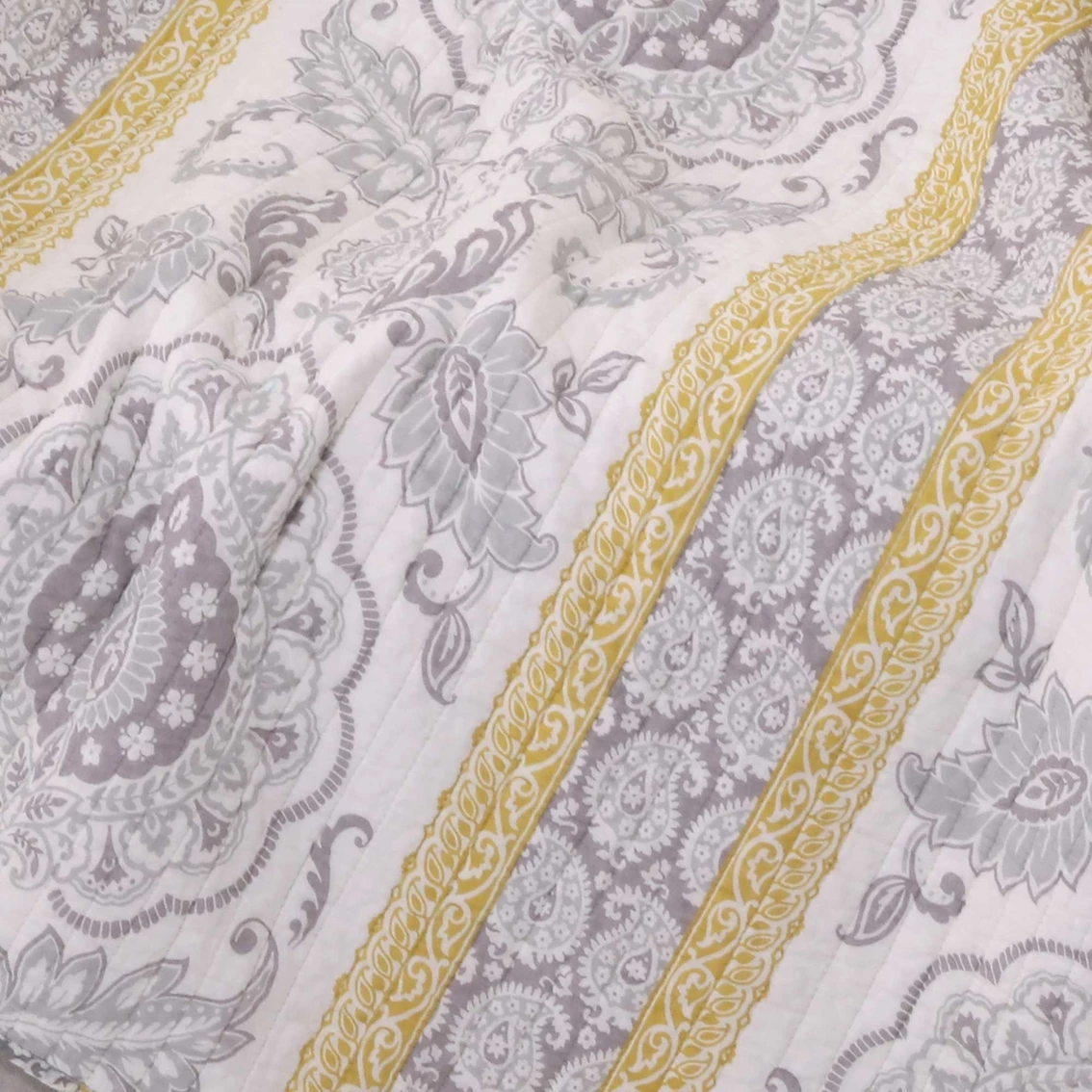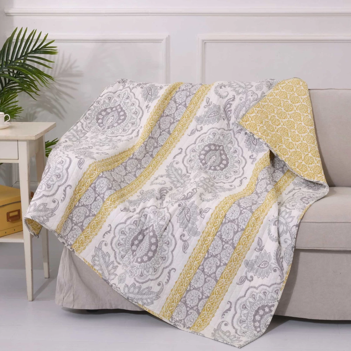One of our most popular sets, St. Claire is inspired by suzani and paisleys, with a grey suzani and yellow paisleys and a charming reverse pattern of yellow paisley icons. A bound border provides contrast and texture to complete the look. Made from 100% cotton that will never feel heavy, stiff or uncomfortable, the St. Claire throw has an ultra soft feel that you’ll simply love. Our throw is very generously sized (50 x 60in.) to give your bedroom a feeling of comfort and luxury. A versatile, floral and paisleys pattern, this throw can be used by itself or, as a layering piece on a bed or couch.