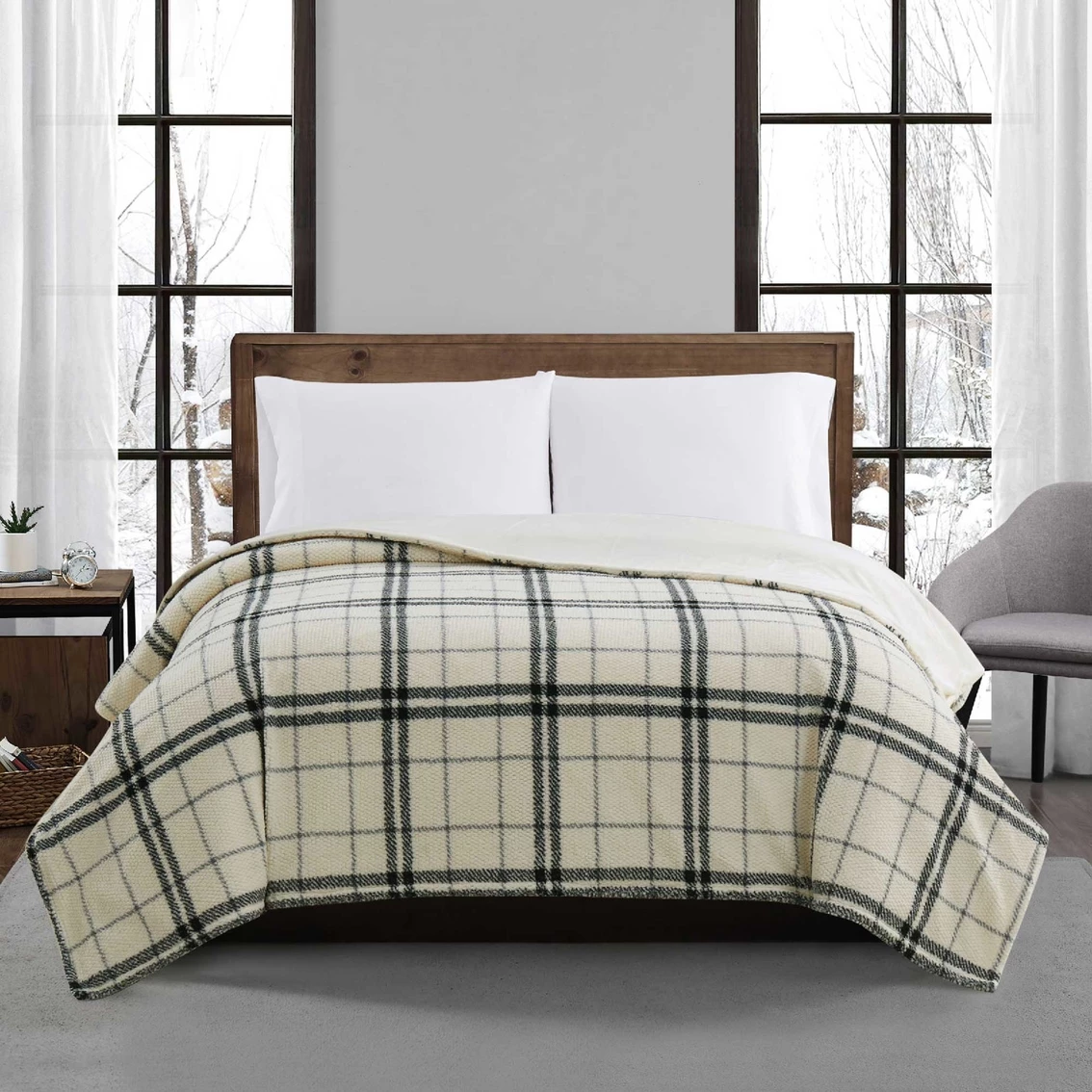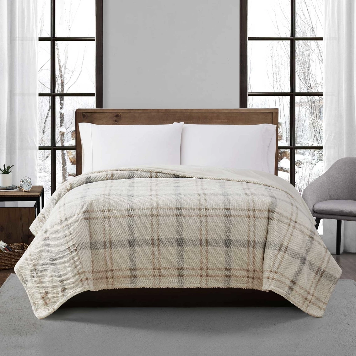 London Fog Popcorn Plaid Plush 50 x 60 in. Throw. Stay warm on a cold night with this innovative surface texture with a sculpted sherpa fabric and a fresh plaid print. Face is 100% polyester plush that is printed and carved for added surface texture and reverses to 100% polyester mink fur. Model: TH3916BR-9100.