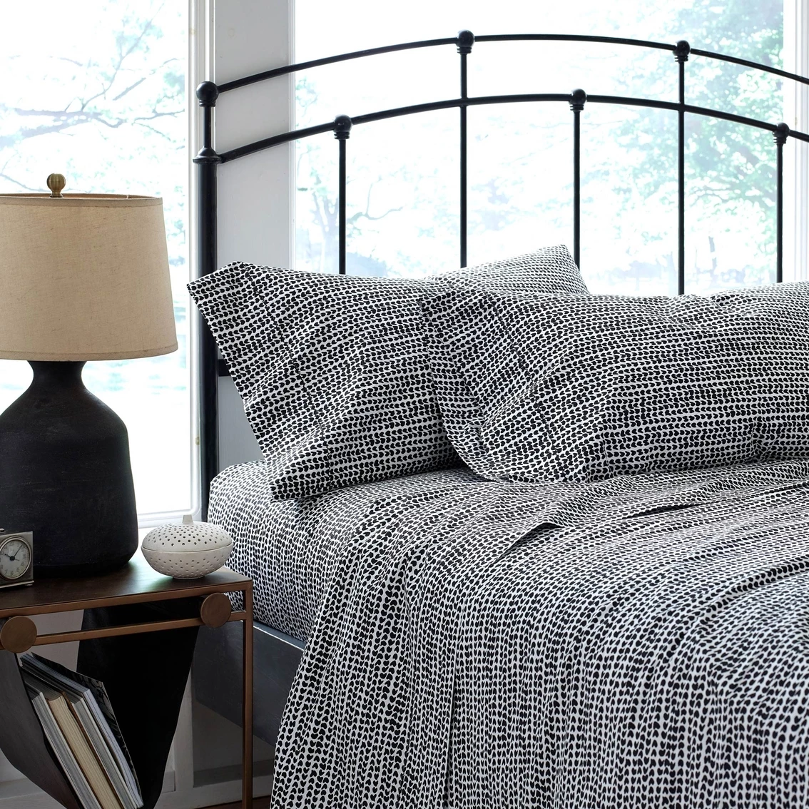 With the Martex Hableland Etching Sheet Set, sisters and textile designers Susan and Katharine Hable bestow their fresh, contemporary aesthetic on the heritage Martex brand. The trendsetting sisters’ timeless style offers eye-catching designs for those who do not shy away from bright, vibrant, fashion-forward colors and bold geometric patterns. Heart-like shapes adorn the Martex Hableland Etching Sheet Set, a geometric design that’s a study in black-and-white contrast. The set’s flat sheet, fitted sheet and pillowcase(s) are made of 100% cotton, so you’ll ease into a good night’s sleep in superior comfort and softness. The Martex Hableland Etching Sheet Set is designed for ease of care; it’s machine washable and dryer safe. And, with its contrasting color palette, it pairs perfectly with the Martex Hableland Quarry Comforter Set (sold separately). Twin and Twin XL sets come with a single standard pillowcase. Machine wash warm with similar colors. Only non-chlorine bleach when needed. Tumble dry medium, remove promptly. Warm iron as needed.