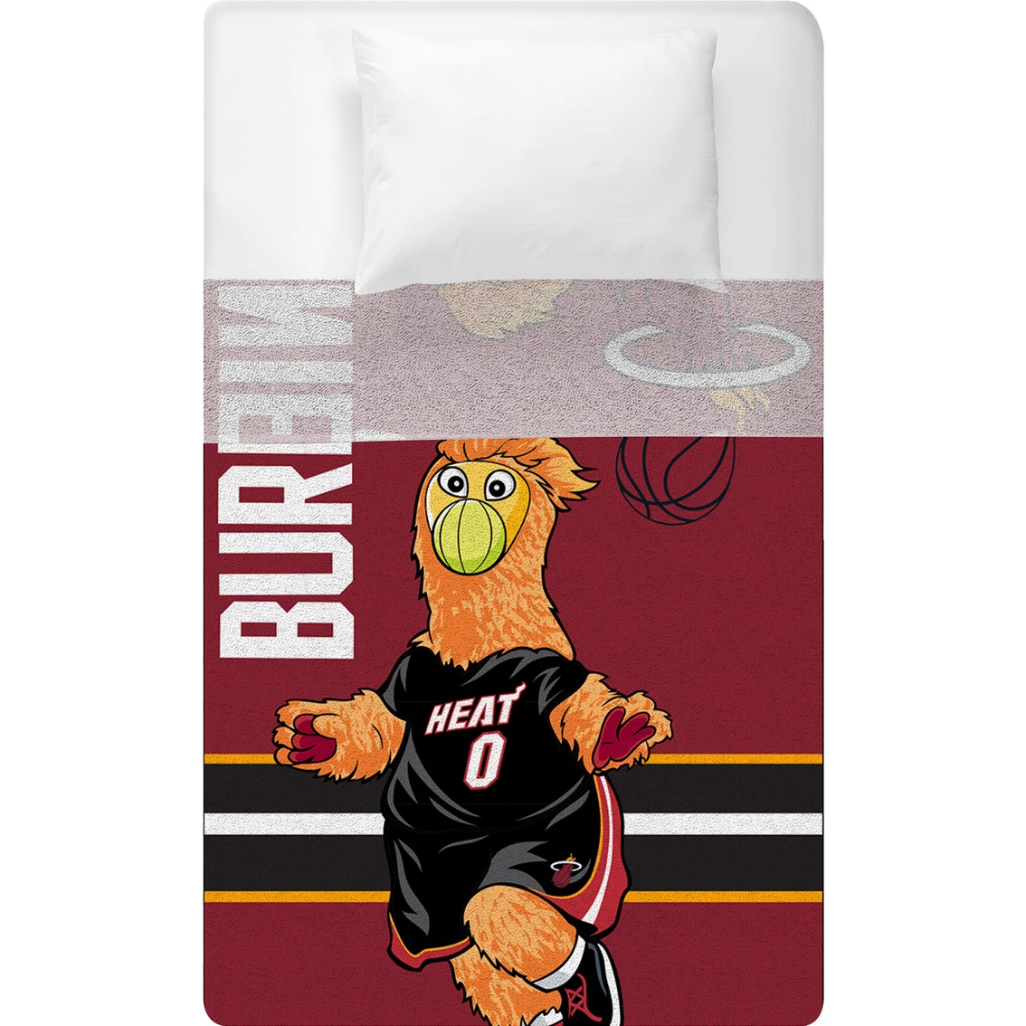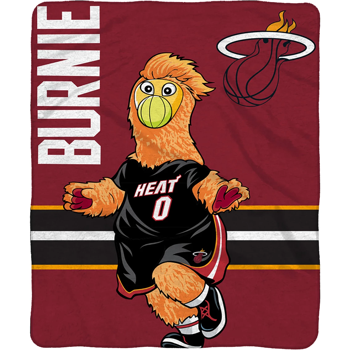 Great for chilling on the couch while watching the Heat, this NBA Miami Heat Burnie mascot throw blanket is 60 in. x 80 in. and made with super-soft Raschel knit with a soft and luxurious feel. The size can allow this throw to be used as a twin size bedspread. Made with 100% polyester, it is machine washable and is officially licensed by the NBA and the Miami Heat. Sleep Squad mascot blankets feature a dynamic graphic design with authentic logos from the team style guides. Model: T8-NBA-HEA-MAS.
