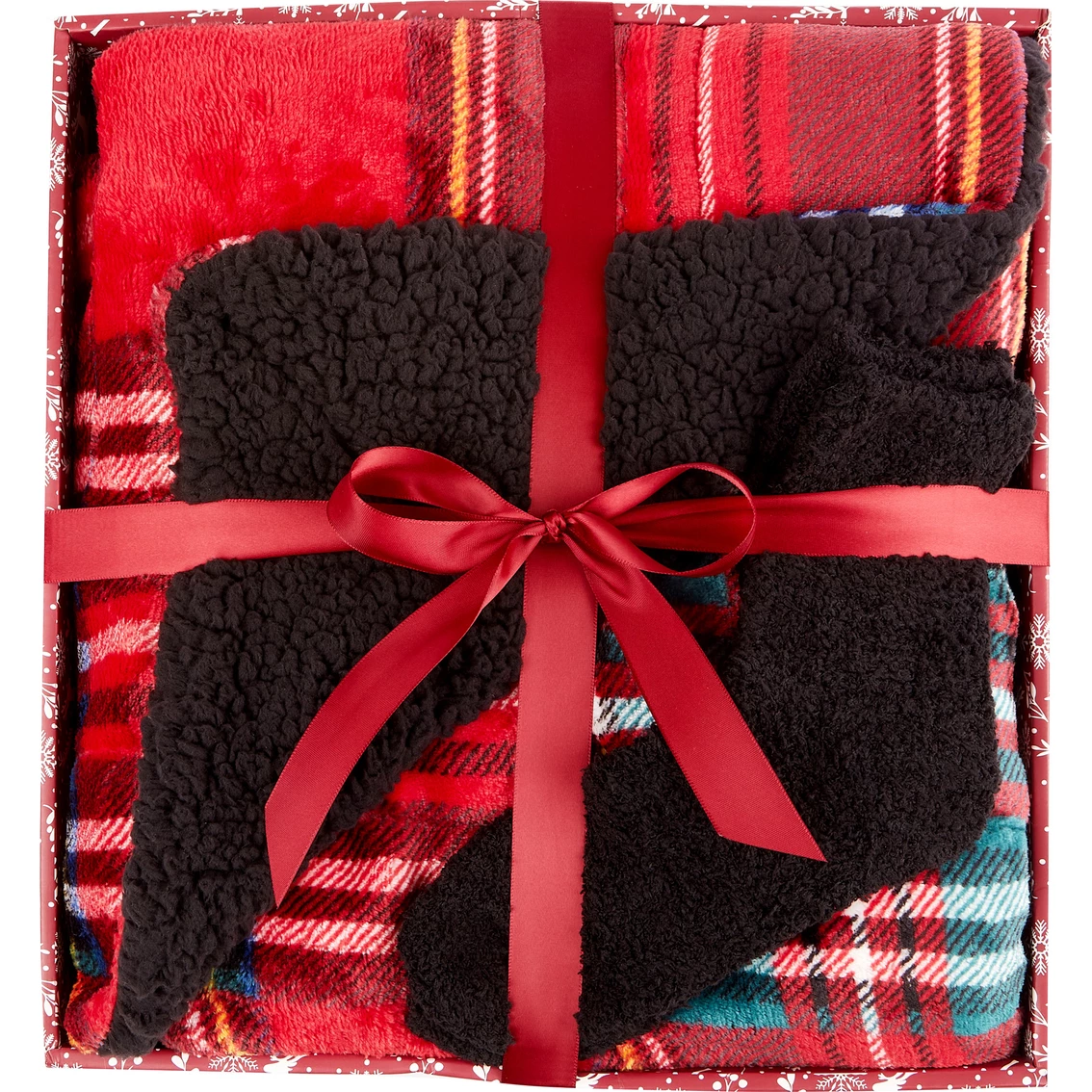 In a red plaid tartan pattern, this sherpa throw blanket from Northpoint comes with bonus socks so that you can feel warm and comfy while snuggling at home. comes in a gift box, making it perfect for gift gifting. Model: 15953.