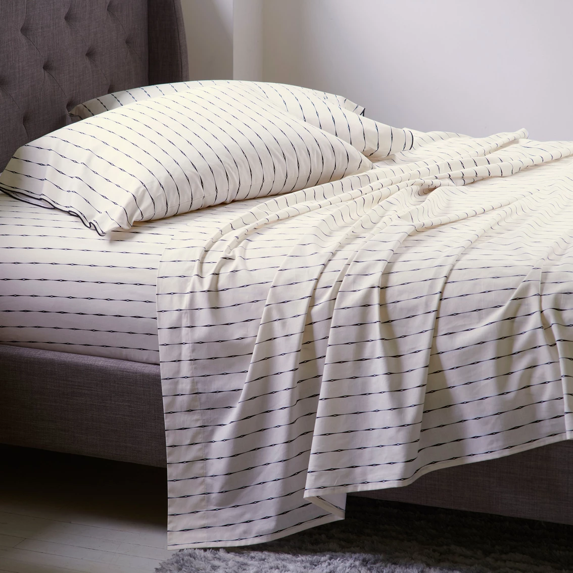 Line up a tailored bedding look with the crisp, allover stripe pattern on the Novogratz by Utica Vintage Stripe Printed Cotton Sheet Set. These 100% cotton sheets are super soft to the touch, ensuring that you’ll comfortably ease into a great night’s sleep. This set includes a flat sheet, a fitted sheet and matching pillowcase(s) appointed with an embroidered edge for a modern feel.