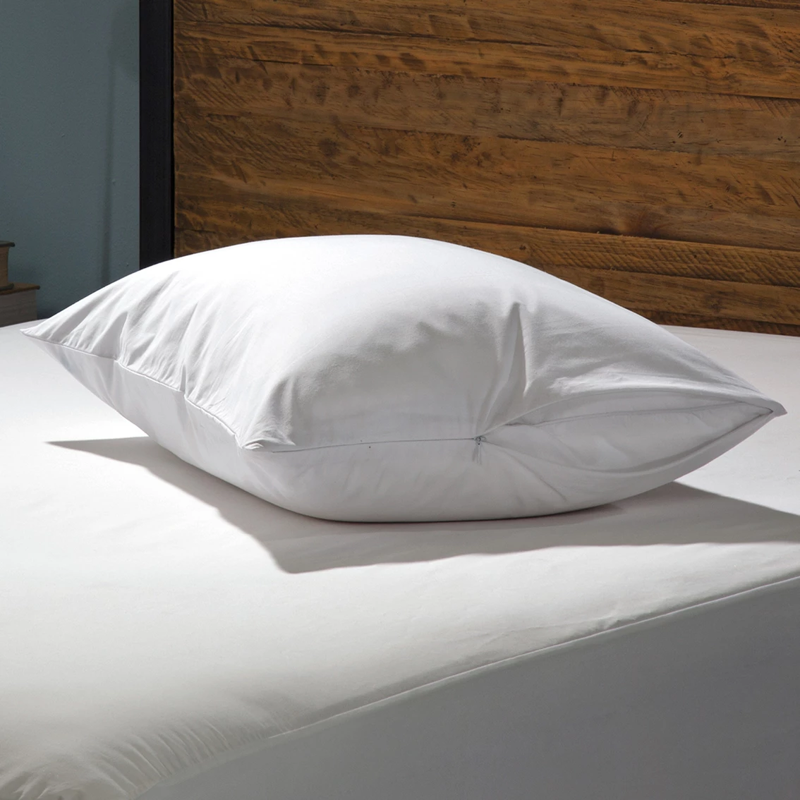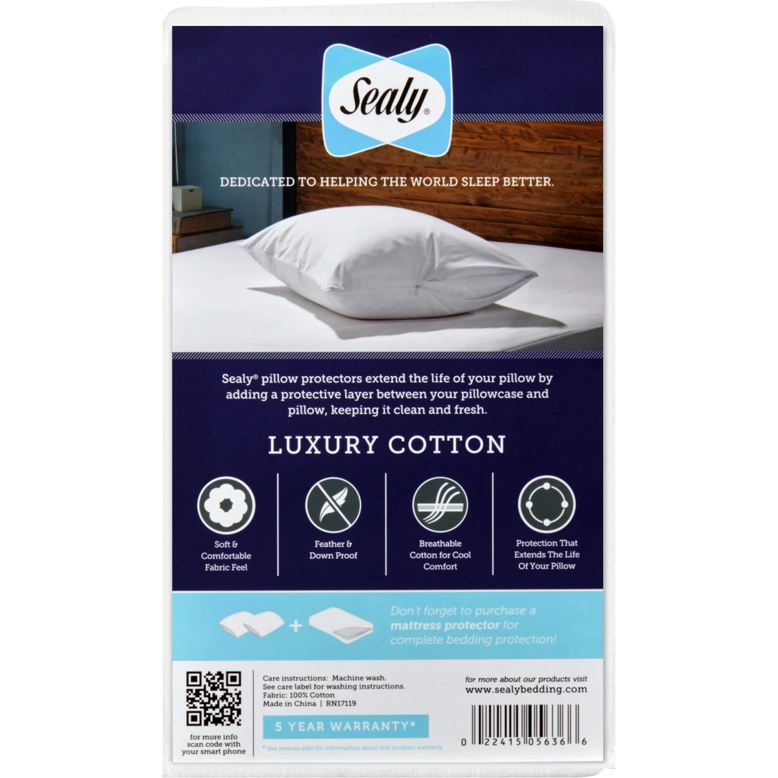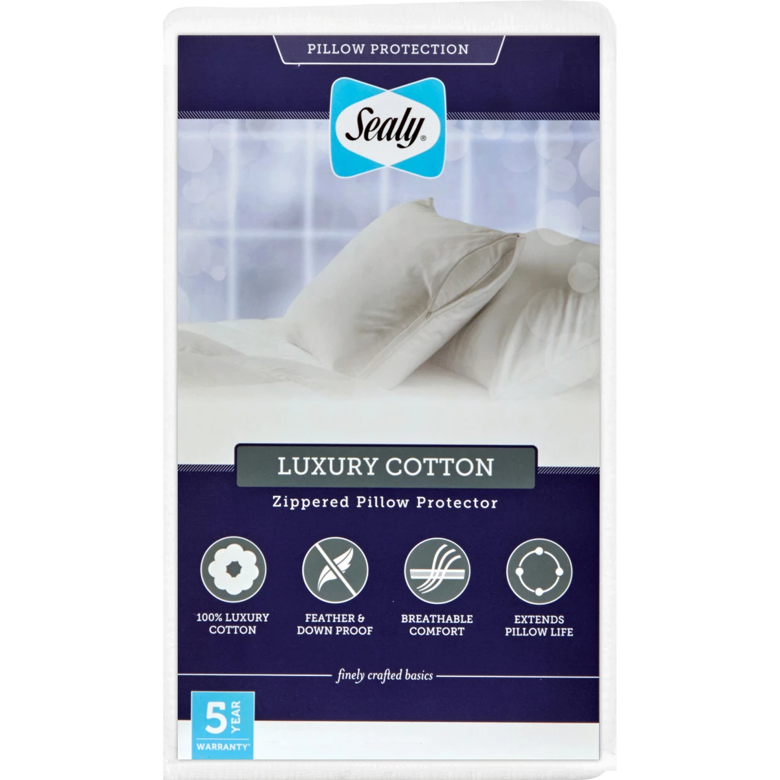 Crafted of 100% luxurious cotton, the Sealy Luxury Cotton Pillow Protector is soft to the touch and will not alter the feel of your pillow. The feather and down-proof cotton cover blocks feathers from down pillows from poking through the fabric, making it the perfect cover for your down pillows. Breathable cotton keeps you cool for ultimate comfort. The zippered closure fully encases your pillow. This pillow protector also helps to extend the life of your pillow by adding a protective layer between your pillowcase and pillow, keeping it clean and fresh. Model: 5628.