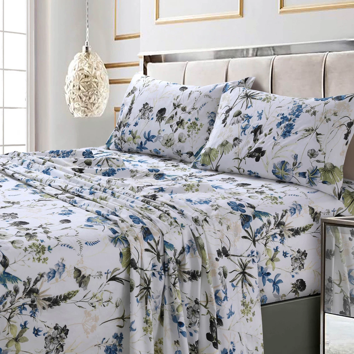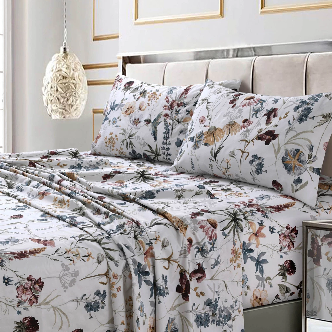 Woven of 300 Thread Count sateen, this 100 percent cotton multicolor printed sheet set features beautiful floral, paisley or tropical pattern. These soft and lustrous sheet sets feature oversized flat and fully elasticized deep pocket fitted sheet to accomodate mattresses up to 22 in. deep. Set includes one flat sheet, one fitted sheet and two standard pillowcases(one in Twin/Twin XL). Machine washable. Model: AMAL4PSSQURE.