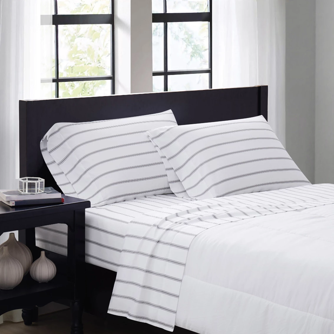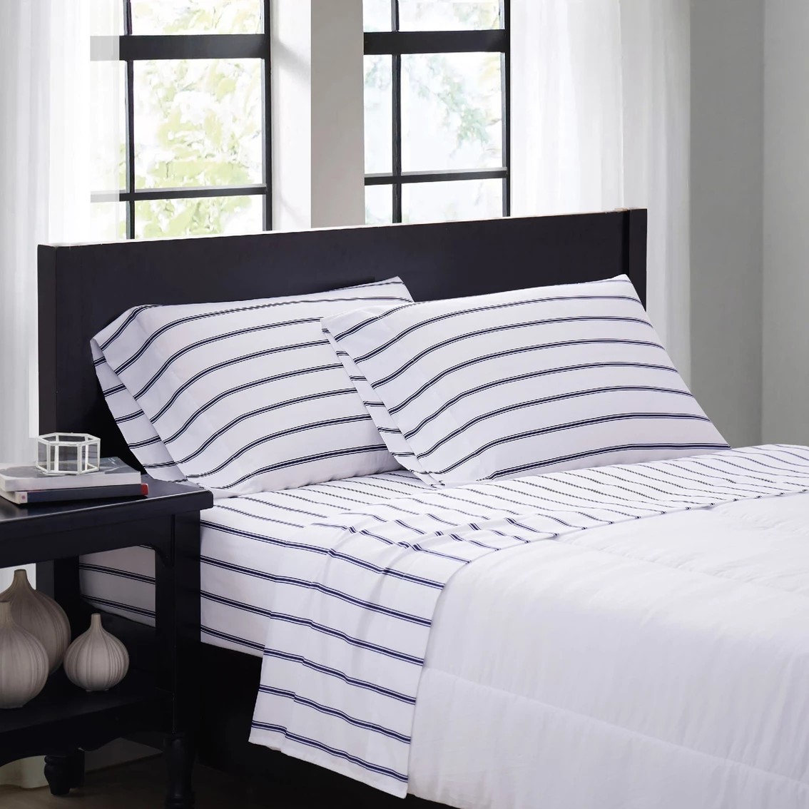 The Truly Soft Ticking Sheet Set pattern uses a white base with a wider spaced stripe. Features a three stripe pattern with two smaller stripes, surrounding a thicker middle stripe in 100% microfiber. Each item in the set is made from 100% microfiber polyester yarns in a percale weave and printed.