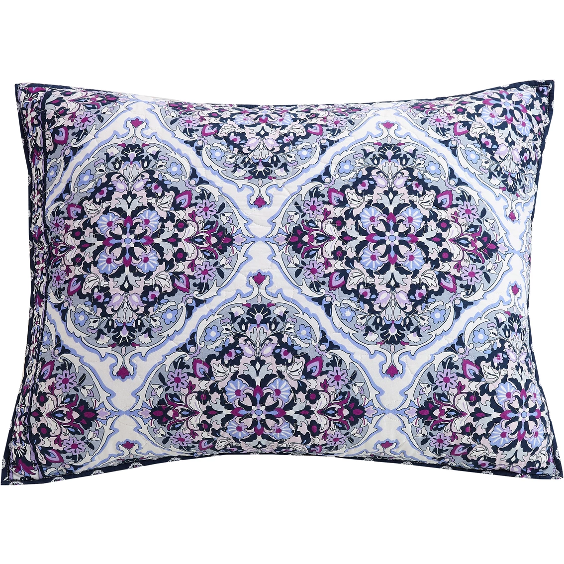 A new floral medallion design from Vera Bradley inspires in shades of purple, lavender and blue on gray. This bold ogee pattern creates a contemporary opulent look in rich colors and is framed with a coordinating pieced border. It reverses to a foulard print, designed with a motif from the top of bed print, in the same gorgeous shades of purple. The simple curves of the quilting pattern complete this great look. Make a stunning statement in your bedroom with this beautiful sham. Composed of 100% cotton. Model: A071818AMOHE.